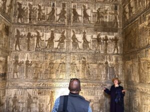 ويعود تاريخ المعبد إلى العصرين البطلمي والروماني ويتميز بواجهة ضخمة حيث يضم 24 عمودا تمثل ساعات الليل والنهار وتعلوها رؤوس الإلهة حتحور مزينة بنقوش دقيقة تعكس روعة الفن المصري القديم.